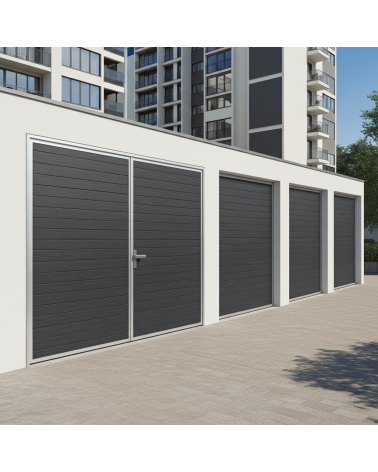 Brama garażowa dwuskrzydłowa Woster PD40AW Brama garażowa dwuskrzydłowa rozwierna z paneli segmentowych 40 mm w kolorze antracyt woodgrain. Konstrukcja aluminiowa wzmacniana stalą ocynkowaną, niski próg 10 mm, zamek z wkładką i rygle, zewnętrzna uszczelka dolna szczotkowa. Możliwość montażu we wnęce lub na elewacji oraz doposażenia w dodatkowe rygle, zamki i odbojniki.